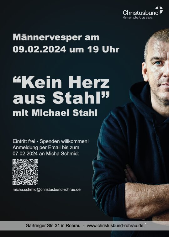 "Kein Herz aus Stahl" Wir laden ein zu einem herzhaften Vesper und einem spannenden Vortrag ! Referent: Michael Stahl - Aussenseiter | Bodyguard | Herzenskämpfer Beginn: 19:00 Uhr Eintritt frei - Spenden willkommen! Deine freiwillige Unterstützung hilft uns solche Veranstaltungen…